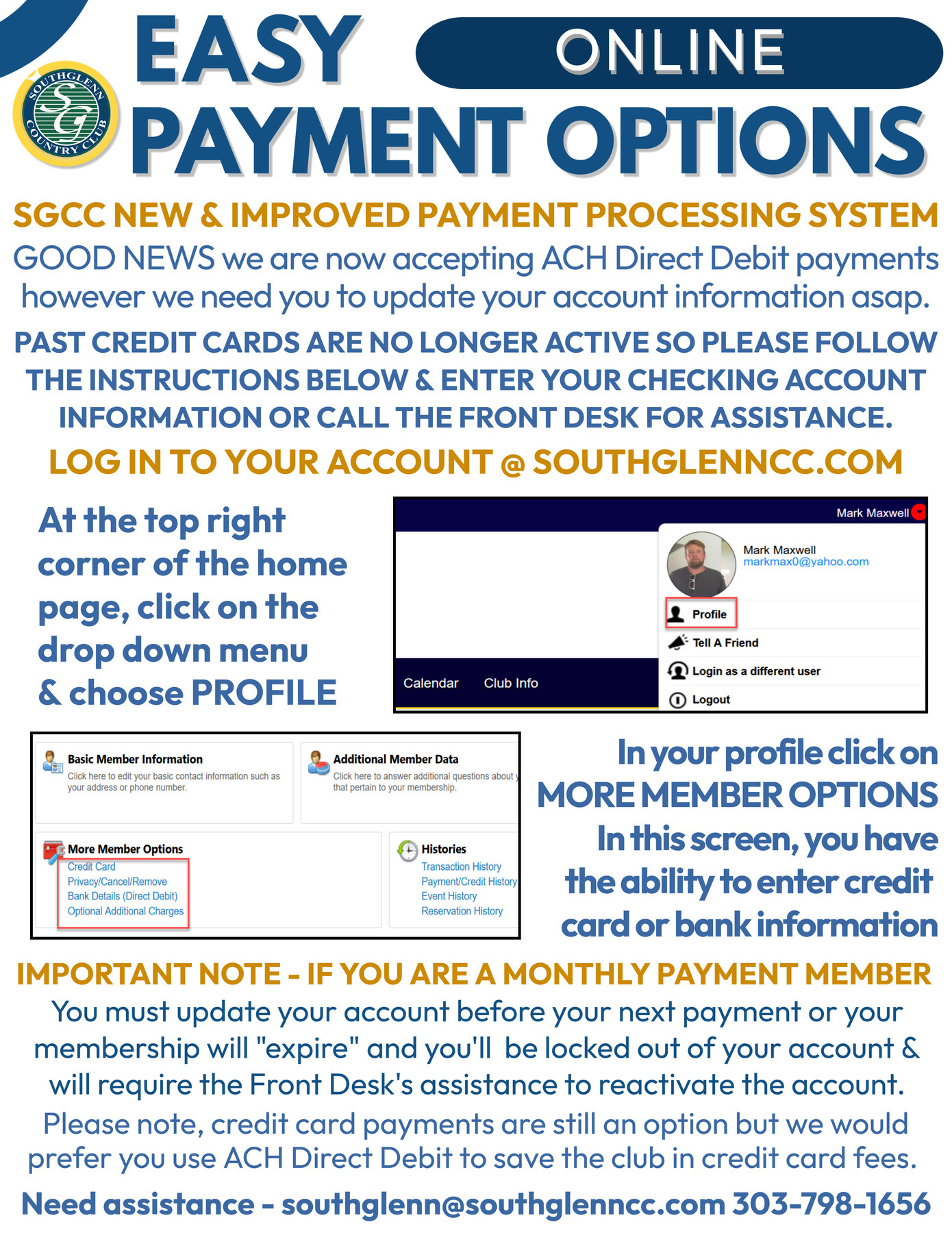 PAYMENT PLAN MEMBERS A NEW METHOD OF PAYMENT REQUIRED PLEASE REVIEW THE INFO BELOW & UPDATE YOUR ACCOUNT TODAY! QUESTIONS, CONTACT THE FRONT DESK